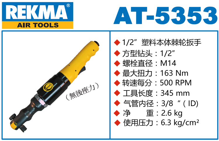 REKMA AT-5353大扭力气动棘轮扳手特点:(重力压铸外壳,强度更高不变形,提高耐用度)