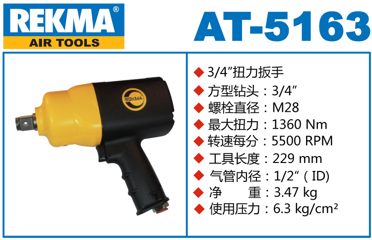 REKMA AT-5163中型气动扳手特点:(重力压铸外壳,强度更高不变形,提高耐用度)