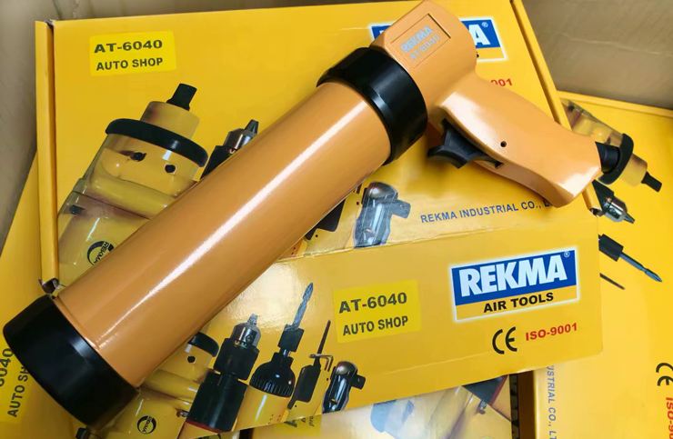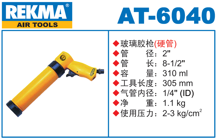 REKMA AT-6040气动胶枪用途: 气动玻璃胶枪是一种打玻璃胶(或挤玻璃胶)的工具,需要施胶的地方都有可能会用到,广泛用于建筑装饰、门窗、电子电器、汽车及汽车部件、船舶及集装箱等行业。REKMA AT-6040气动胶枪特点:1.用空气为动力,节能环保还防爆,工作效率高。2.噪音低,不影响周边环境。3.加装调压表,可以通过调整气压来控制出胶量。本机适合硬装玻璃胶