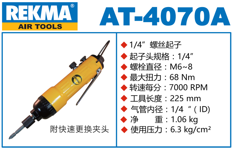 REKMA AT-4070A气动螺丝刀特点:(重力压铸外壳,强度更高不变形,提高耐用度)