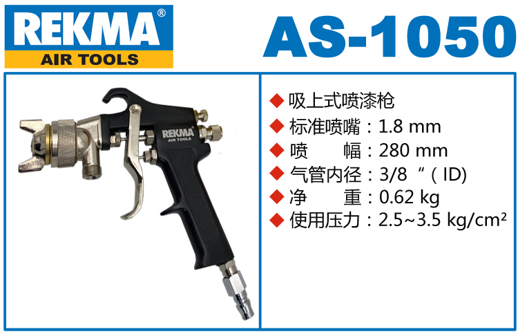 锐克马REKMA AS-1050喷漆枪是利用液体或压缩空气迅速释放作为动力的一种设备。喷枪分为普压式和加压式两种。喷枪还有压力式喷枪、卡乐式喷枪、自动回收式喷枪。
