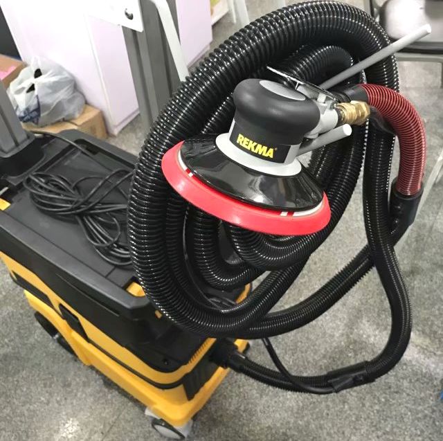 3、台湾锐克马高品质工业级气动砂纸打磨机,经久耐用,耗气少排气噪音低,新型专利吸尘结构,吸尘效果更好,螺纹口设计,吸尘管再也不会打磨时松脱了